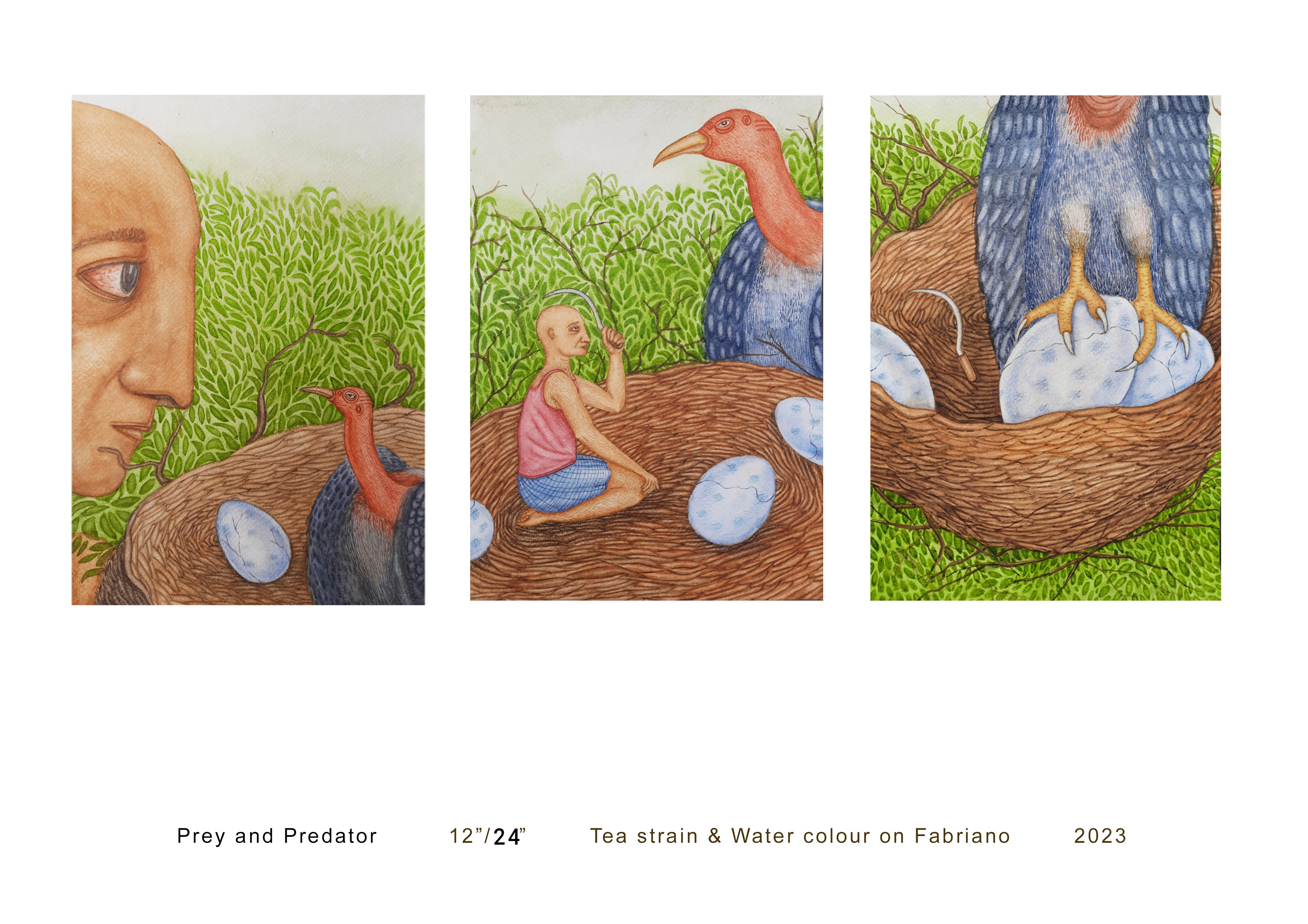 Prey and Predator In this painting, I reverse the traditional roles of prey and predator to question the structures of power in contemporary society. The work reflects on how the truly innocent often become victims—cornered, silenced, or manipulated by those who command political influence or possess destructive authority. By shifting the balance of power, the painting imagines a moment when the victim rises—when the hunted gains strength, voice, and agency. In this reversal, the once-mighty predator becomes vulnerable, ensnared in the very web of politics and dominance they created. Through this transformation, the work speaks to the fragile and cyclical nature of power: those who exploit others may one day confront the consequences of their own actions, becoming prey to the systems they built.