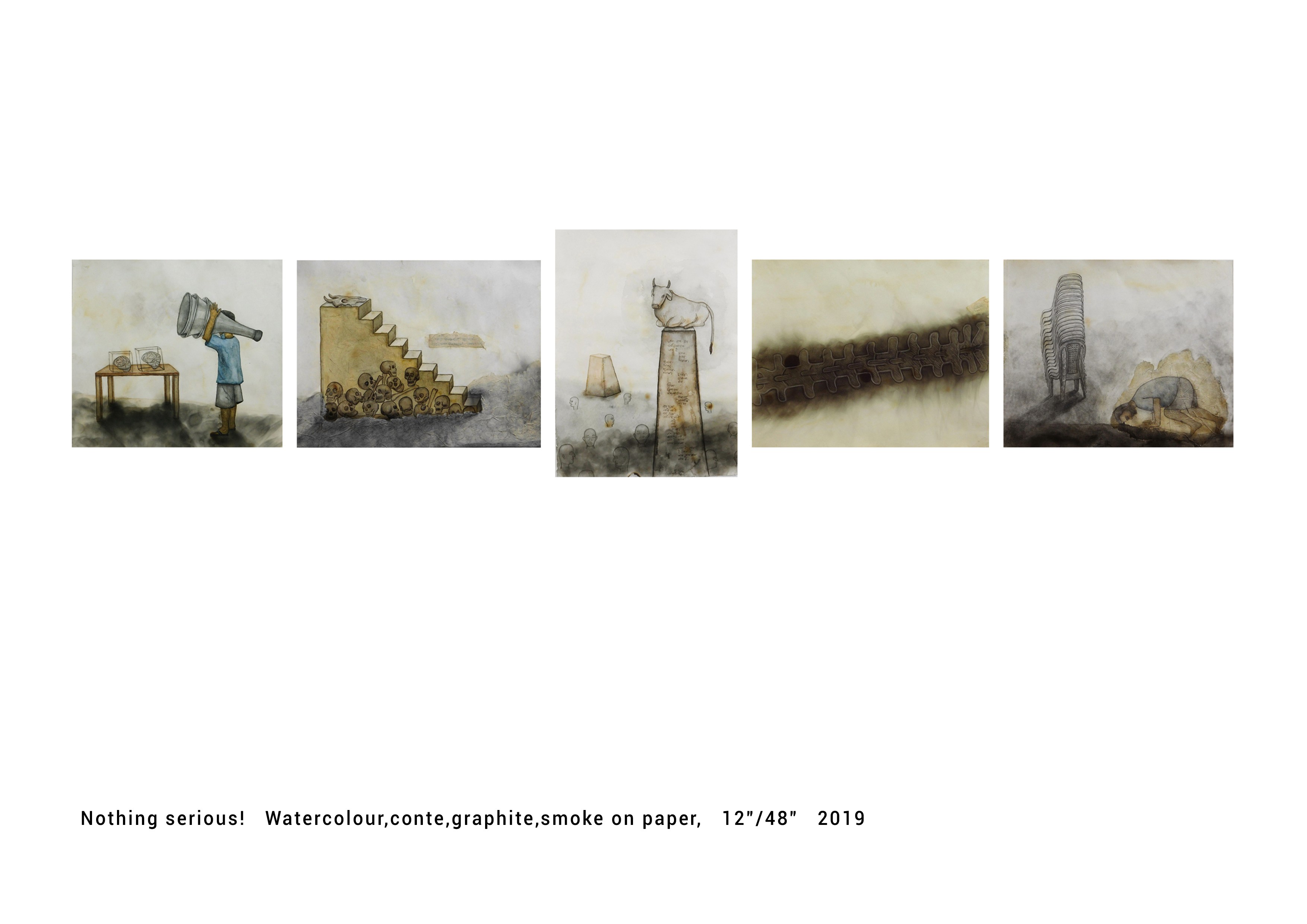 Nothing Serious! This series unfolds like a quiet yet piercing testimony to the political endurance woven into everyday life. Each panel appears gentle at first glance—washed in soft tones, smoke-stained textures, and muted gestures—yet beneath this calm surface lies a landscape shaped by anxiety, absurdity, and silent resistance. From a child struggling to lift oversized microphones meant for political slogans, to staircases constructed upon piles of skulls, to the elevated cow presiding like an untouchable deity—every motif exposes the unsettling hierarchies of our times. In today’s political climate, the worth of human life often feels diminished, while symbols and animals—especially the cow—are raised to a place of greater sanctity than the people themselves. Across these images, human figures bend, crouch, observe, or silently endure. Their spines appear impossibly elastic yet unbroken—an allegory of the resilience demanded from citizens navigating systems that prioritise power over empathy. The recurring haze of smoke becomes a metaphor for suffocation: the air thick with unspoken fears, unresolved histories, and the quiet pressure of survival. Despite its deceptively casual title, Nothing Serious! reveals an unvarnished truth about contemporary existence—how we learn to bear the weight of political absurdity, how we bend without collapsing, and how humour, irony, and endurance become our subtle tools for living through times that constantly test the limits of patience and humanity.