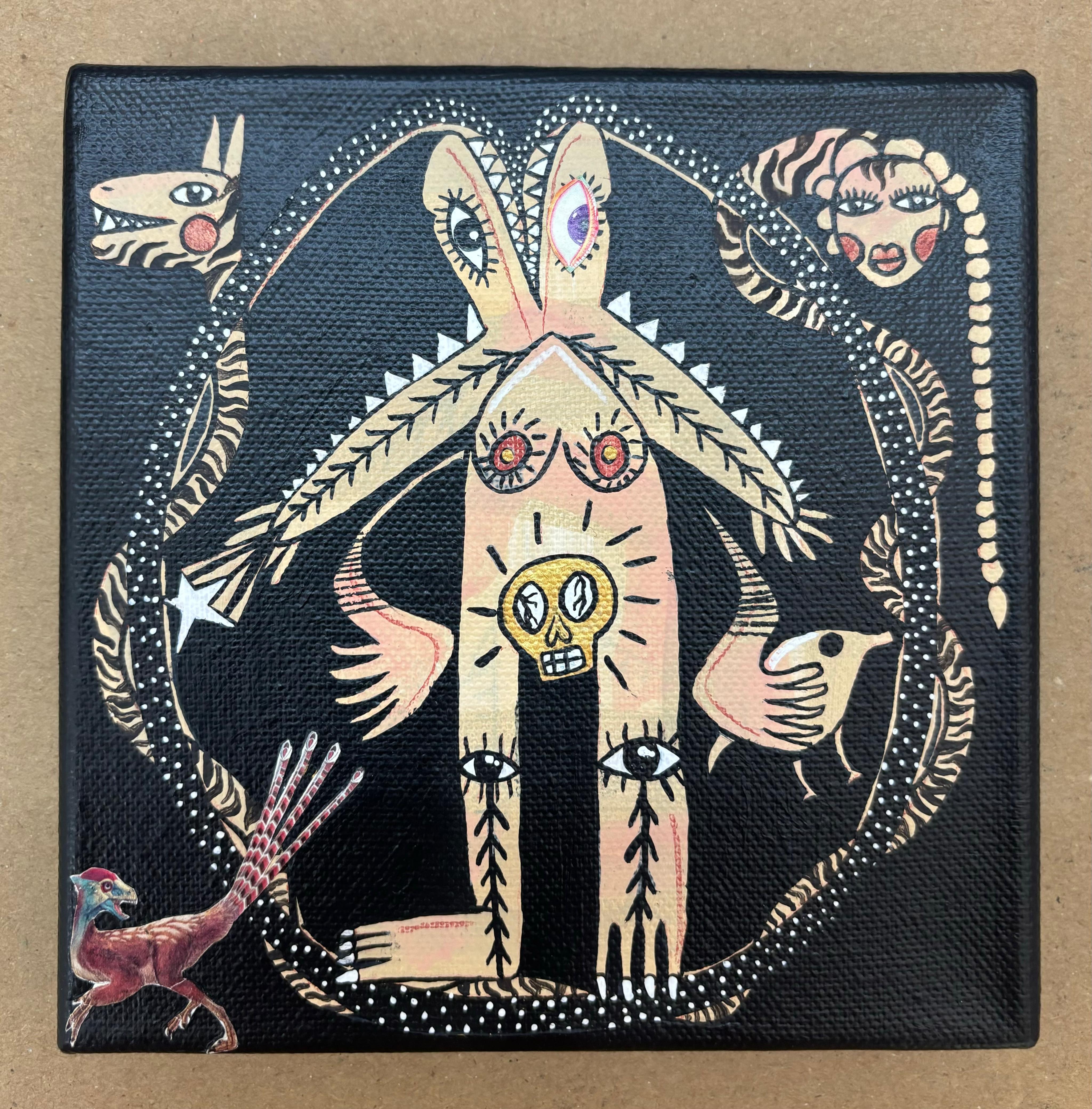 Acrylic, paper collage, pink leaf, skull beads and eyes on teak wood