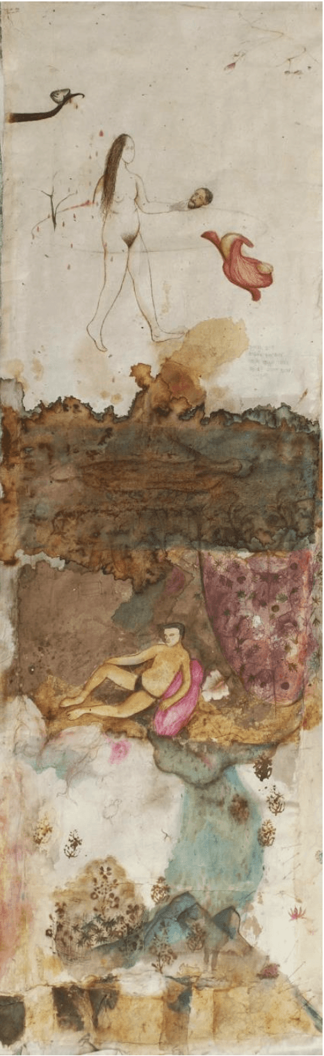 natural pigment, gouache colour, tea stain, and block print on rice paper paste on (pata ) cloth scroll surface