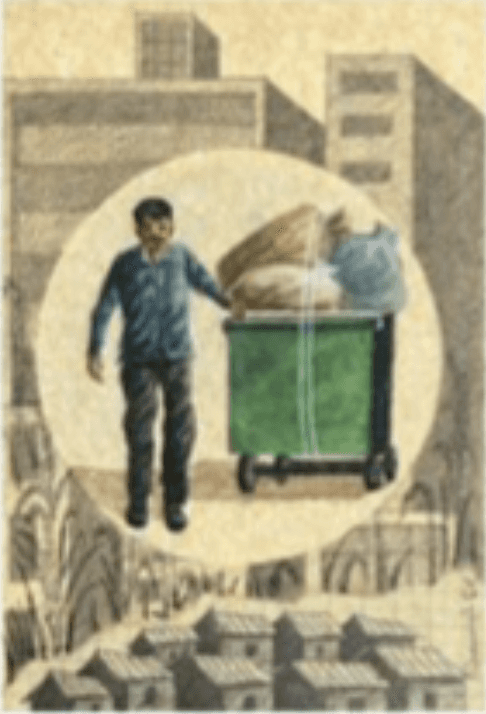 This work consists of characters that reflect my observations of the activities and different jobs taken up by people who leave their villages due to the degradation of farming. All the characters are placed within a circle to create a focal point, while the drawings outside the circle represent the crowded city and the environmental degradation caused by human needs.