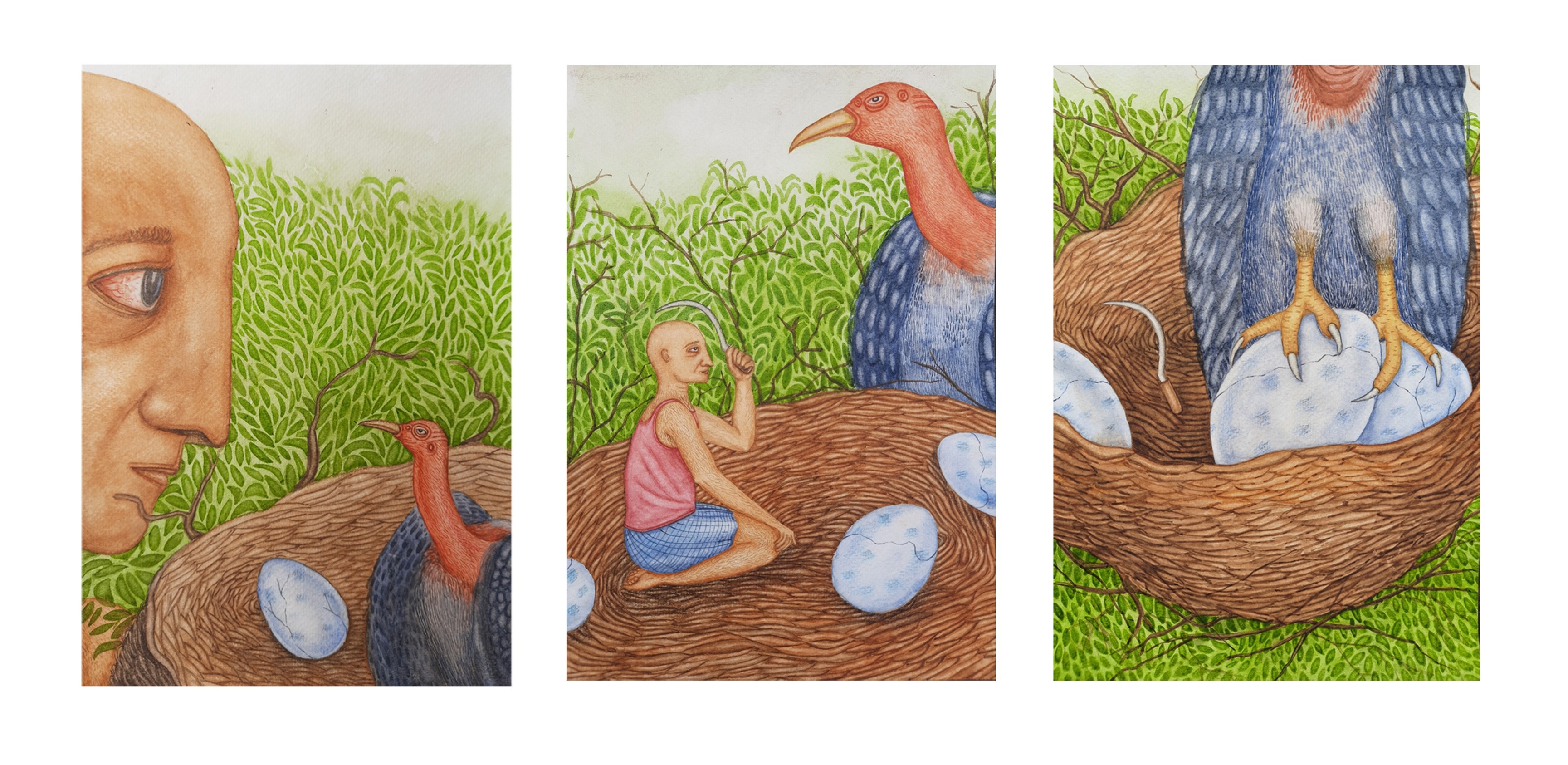 Prey and Predator In this painting, I reverse the traditional roles of prey and predator to question the structures of power in contemporary society. The work reflects on how the truly innocent often become victims—cornered, silenced, or manipulated by those who command political influence or possess destructive authority. By shifting the balance of power, the painting imagines a moment when the victim rises—when the hunted gains strength, voice, and agency. In this reversal, the once-mighty predator becomes vulnerable, ensnared in the very web of politics and dominance they created. Through this transformation, the work speaks to the fragile and cyclical nature of power: those who exploit others may one day confront the consequences of their own actions, becoming prey to the systems they built.