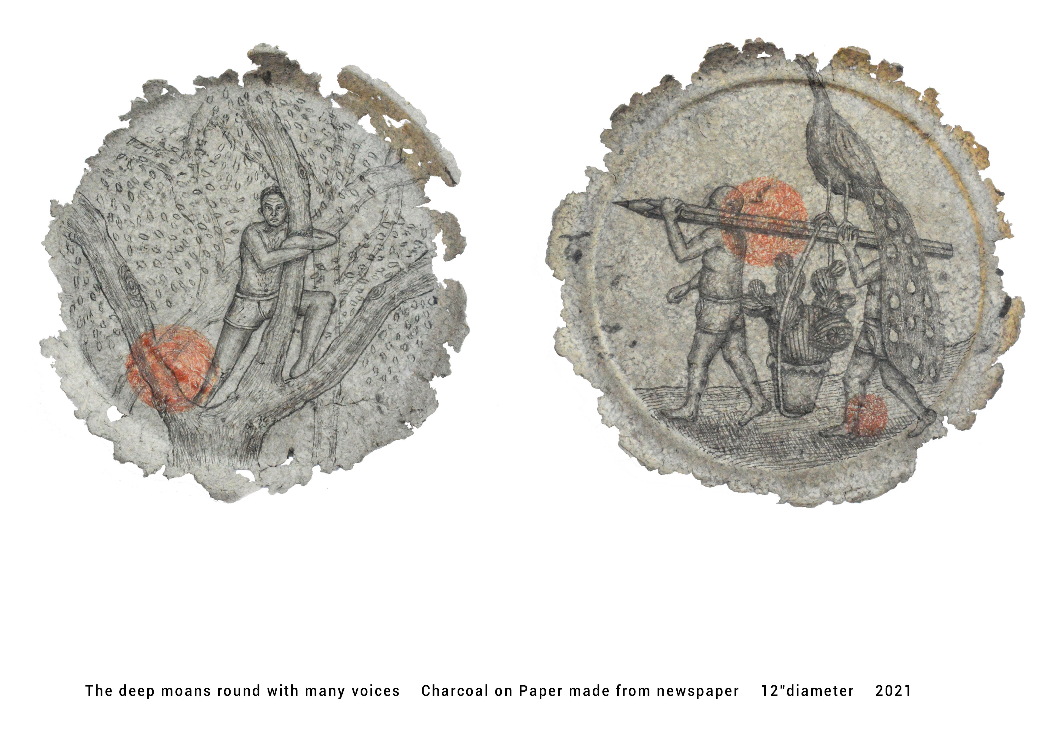 The Deep Moans Round With Many Voices In this painting, I transform old newspapers into a handmade plate—its form echoing the humble food-serving plates found in middle-class Indian homes. This recycled paper plate becomes a site of memory and meaning, carrying the weight of lived reality. Upon its surface lies a charcoal drawing, a quiet yet potent metaphor for the socio-political injustices that press upon the lower middle class. The fragile paper, once filled with headlines and promises, now becomes a vessel that reveals how policies—especially those related to education—shape, burden, and often fail the common people. Through this everyday object, reconstructed and reimagined, the work listens to the “many voices” of those who bear the consequences of shifting governance. It reflects on how the ordinary plate—symbol of sustenance and survival—also becomes a silent witness to the struggles of a nation’s most vulnerable minds and futures.
