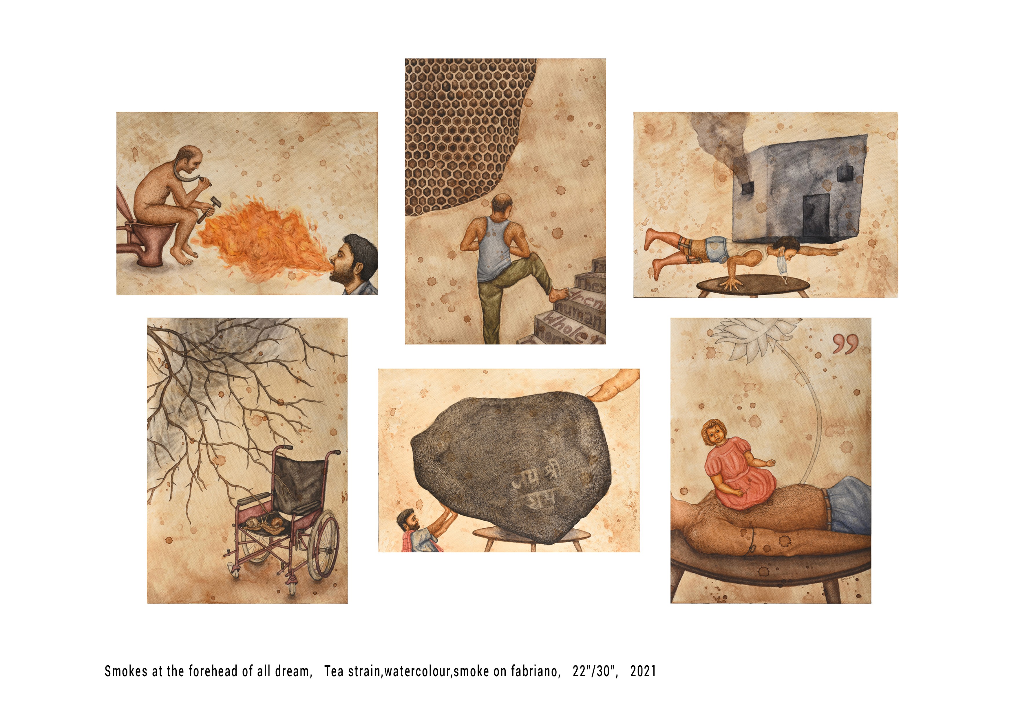 Smokes at the Forehead of All Dream Created during the unsettling months of the lockdown, this work becomes a quiet chronicle of migrant workers’ struggle for existence—men and women treated almost like animals, trapped between responsibility and helplessness. As the only earning members of their families, they longed to return home, yet the restrictions of governance severed that journey. Life continued to move, yet in strange, painful ways—flowing forward while forcing the poor and middle-class into harsh, awkward battles for survival. In contrast, voices of privilege spoke casually of “psychological disorders,” a discourse that felt distant and insensitive to the everyday crises faced by common people. This tension—between lived suffering and detached commentary—threads through the painting in layers of metaphor and absurdity. Several symbolic references appear: A staircase carries Swami Vivekananda’s Chicago address, only to be stepped on by a careless figure—a gesture symbolising arrogance toward cultural legacy. A small doll, drawn from Bikash Bhattacharjee’s iconic series, becomes a metaphor for the fragile girl-child, frightened within the patriarchal structures that persist even in times of crisis. Sisyphus’ boulder reappears, engraved with political slogans, merging myth with contemporary burdens and the repeated weight imposed on citizens. Two snails in an intimate moment rest upon a wheelchair—life halted, yet continuing in its own instinctive rhythm, suggesting tenderness even within stagnation. Across the painting, smoke, tea stains, and muted colours blur the boundary between dream and despair. Life becomes a restless roller coaster—laden with curses, yet still filled with small, stubborn dreams that persist despite suffocation. Smokes at the Forehead of All Dream becomes not just an artwork, but a lament, a protest, and a testament to endurance—where every figure, object, and gesture quietly reveals the emotional and political turbulence of a world paused, yet painfully alive.