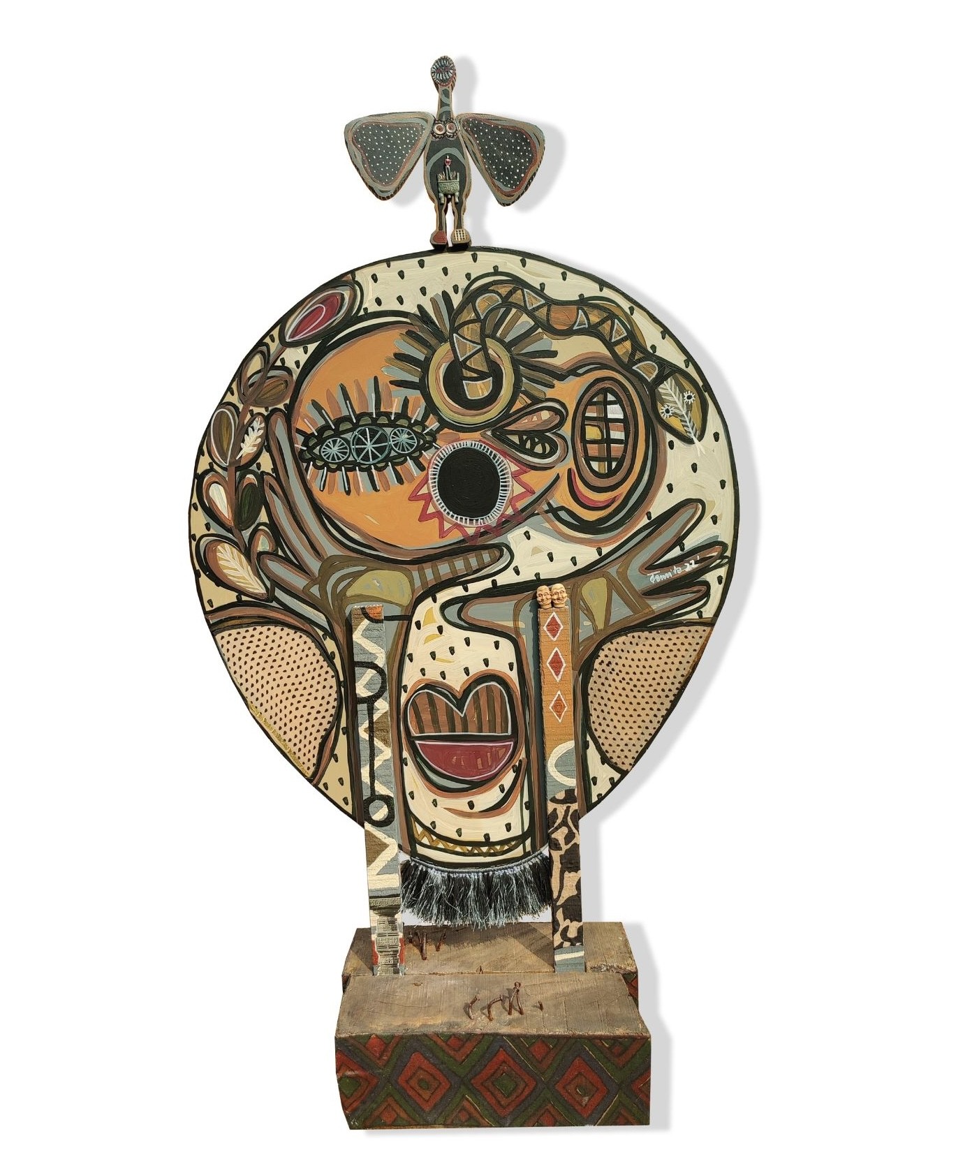 Acrylic, Fabric, Paper Collage, and Sculpy Clay on Wood