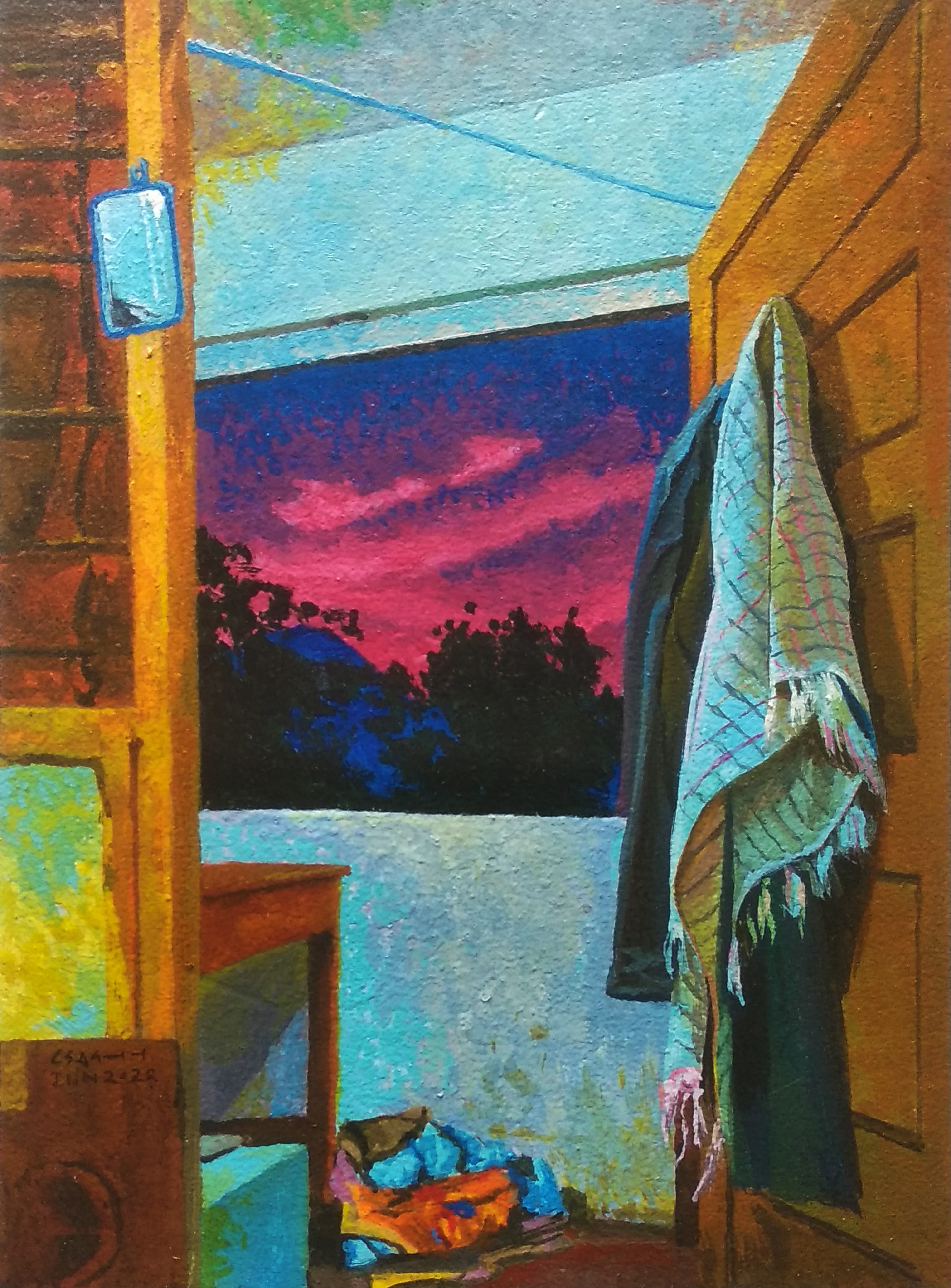 A quiet hostel room watching the sunset through the window.