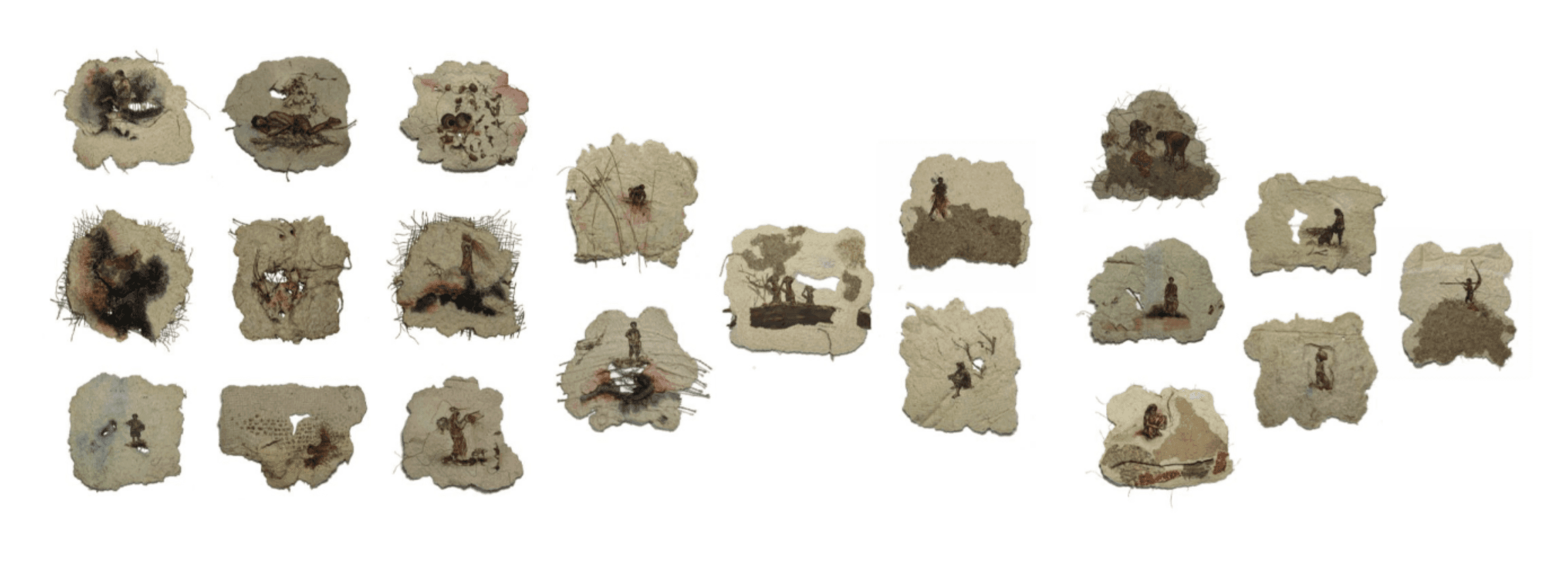 Straw Pulp, Tea Leaf, GI Wire, Bandage, Iron Dust, Natural Fibers, Ink, and Watercolour