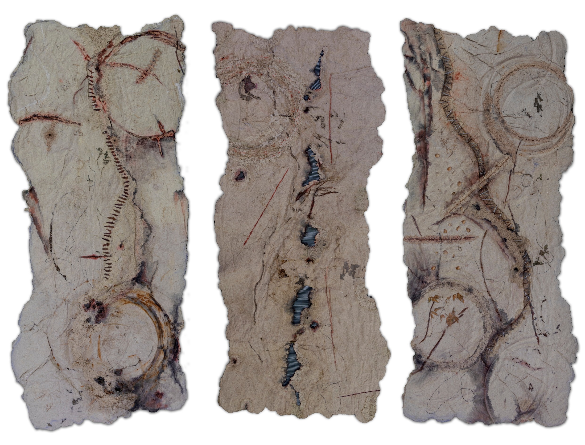 Straw Pulp, Tea Leaf, GI Wire, Bandage, Iron Dust, Natural Fibers, Ink, and Watercolour