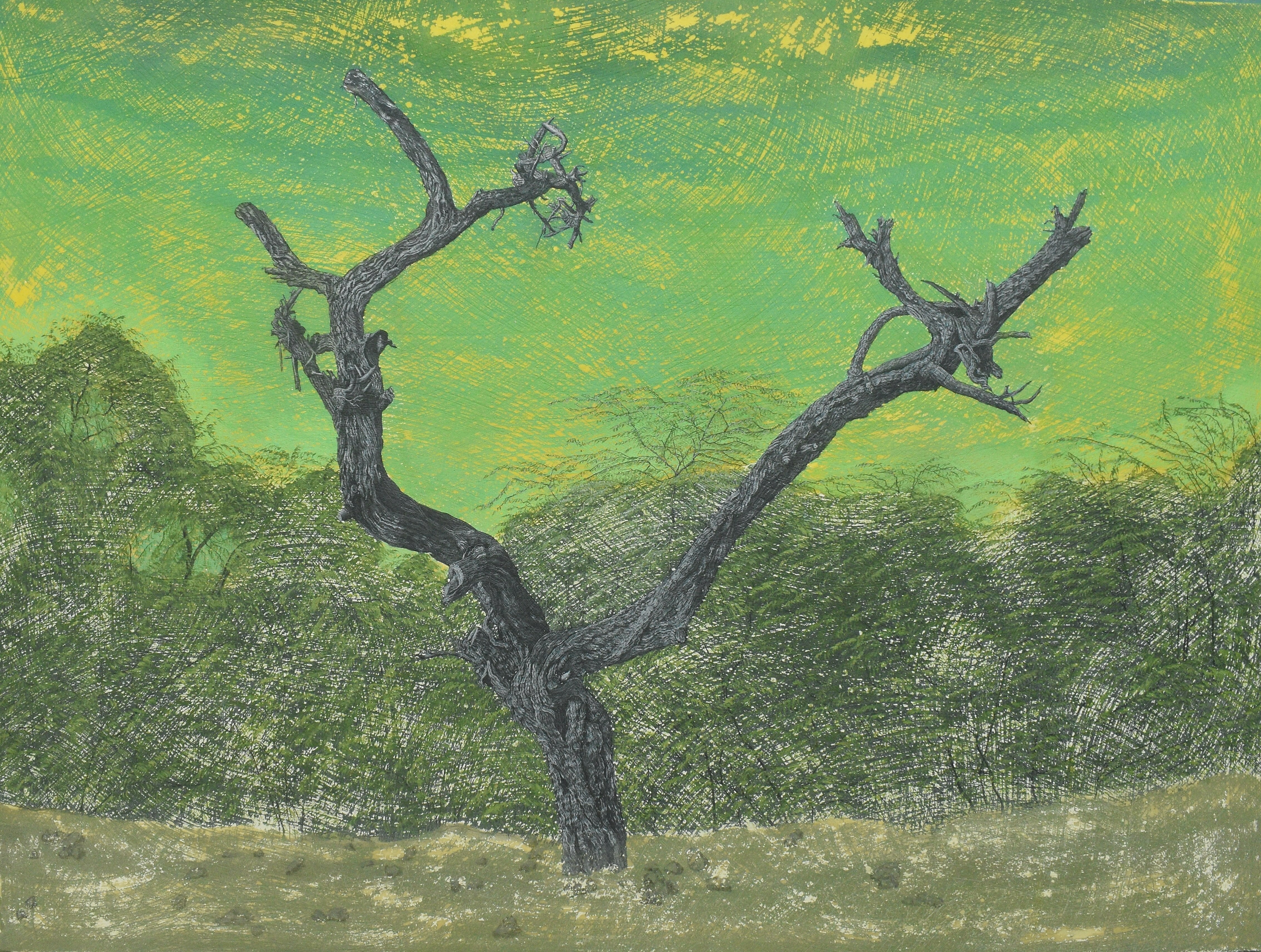 Acrylic, Local Clay, Tree Remains, Bark on Wood Panel